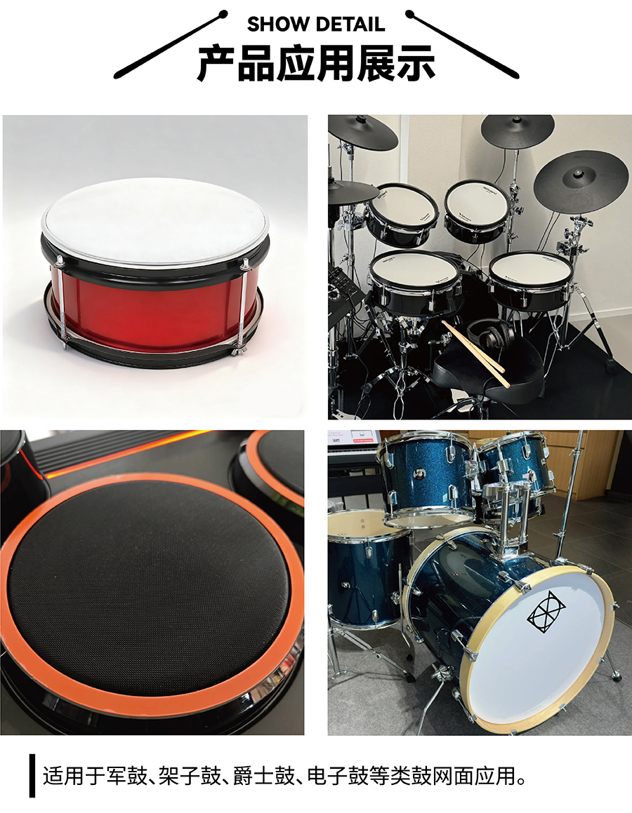 鼓皮絲網(wǎng)是覆蓋于鼓皮表面或鼓腔外側(cè)的防護(hù)與聲學(xué)輔助配件,主要采用尼龍、聚酯或特殊化纖材質(zhì)經(jīng)精密編織制成,核心定位是 “保護(hù)鼓皮 + 優(yōu)化聲學(xué)表現(xiàn)”,尤其以硬挺質(zhì)感為核心優(yōu)勢,適配架子鼓、非洲鼓、手鼓等多種鼓類樂器。